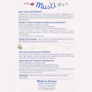Musti Eau De Soin is an aromatic baby perfume consisting of a blend of subtle citrus notes with hints of rose, lilac, and amber. It is the ideal fragrance you can use to keep your baby smelling deliciously fresh and to refresh baby’s linens or clothes.