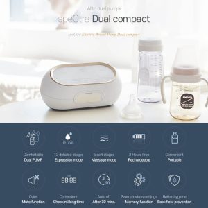Spectra Dual Compact Portable Double Breast Pumps is an electric, portable, double breast pump for personal use that is rechargeable and can last up to 2 hours. It features a unique function that allows mommies to adjust each side independently, for a more productive and comfortable breast pumping session. Like all Spectra pumps, it features a true-closed system, creating a hygienic barrier between contaminates and our mommy’s milk. The LED screen makes it easy to pump in the dark. Designed to accommodate your lifestyle. Thanks to its compact design and built-in rechargeable battery, you can pump anytime, anywhere.